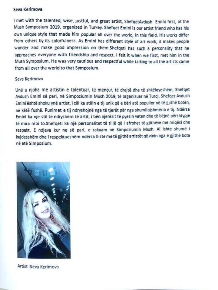 Unë u njoha me artistin e talentuar, të mençur, të drejtë dhe të shkëlqyeshëm, Shefqet Avdush Emini për herë të parë, në Simpoziumin Mush 2019, të organizuar në Turqi. Shefqet Avdush Emini është shoku ynë artist, i cili ka stilin e tij unik që e bëri atë popullor në të gjithë botën, në këtë fushë. Punimet e tij ndryshojnë nga të tjerët për nga shumëllojshmëria e tij. Ndërsa Emini ka një stil të ndryshëm të artit, i bën njerëzit të pyesin veten dhe të bëjnë përshtypje të mira mbi to. Shefqeti ka një personalitet të tillë që i afrohet të gjithëve me miqësi dhe respekt. E ndjeva kur ne së pari, e takuam në Simpoziumin Mush. Ai ishte shumë i kujdesshëm dhe i respektueshëm ndërsa fliste me të gjithë artistët që vinin nga e gjithë bota në atë Simpozium.