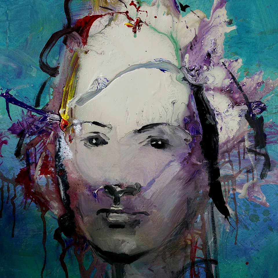 Në anën e majtë të imazhit, shihet një portret femëror i pikturuar me teknikë akriliku mbi kanavacë, ku ngjyrat shpërthejnë si zjarr i përbrendshëm, duke krijuar një tension të brishtë mes bukurisë dhe melankolisë. Fytyra e gruas, me sytë që shikojnë tej, e mbushur me një heshtje të ngarkuar me ndjeshmëri, përfaqëson më shumë sesa një fytyrë – ajo është një simbol.