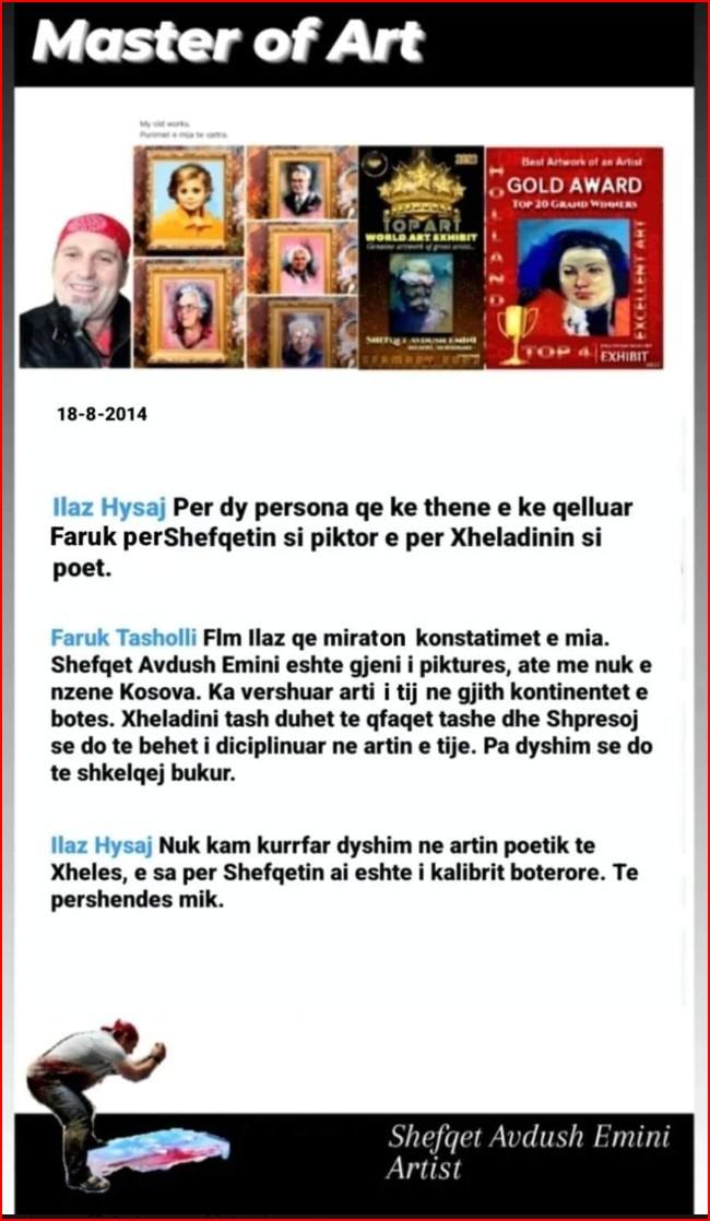 Deze daad is het bewijs dat ware kunst universeel menselijk, lichamelijk en spiritueel is. In 2010 creëerde Shefqet Avdush Emini niet alleen een schilderij – hij creëerde een artistiek moment dat in het geheugen van de hedendaagse kunstgeschiedenis zal blijven als een teken van moed, passie en authenticiteit.