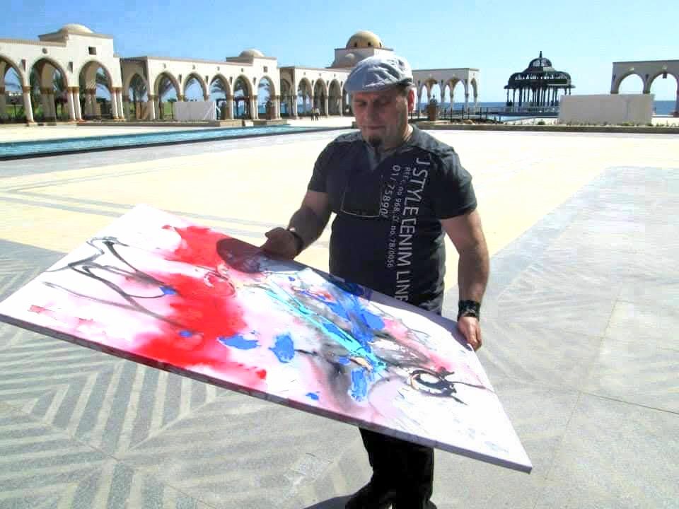 Pozicioni i tij, i përkulur lehtë mbi pikturë, tregon një përqendrim të plotë, sikur po dëgjon vetë telajon, duke i lejuar asaj t’i tregojë se ku duhet vendosur pika tjetër e ngjyrës. Mjedisi përreth – arkitektura madhështore me harkada arabe, drita e fortë e diellit të Egjiptit, afërsia me detin – krijon një skenografi që i jep dimension ndërkombëtar momentit. Është si një metaforë për mënyrën sesi arti i tij lundron nga një kulturë në tjetrën, duke thyer kufijtë gjeografikë e duke krijuar ura shpirtërore.