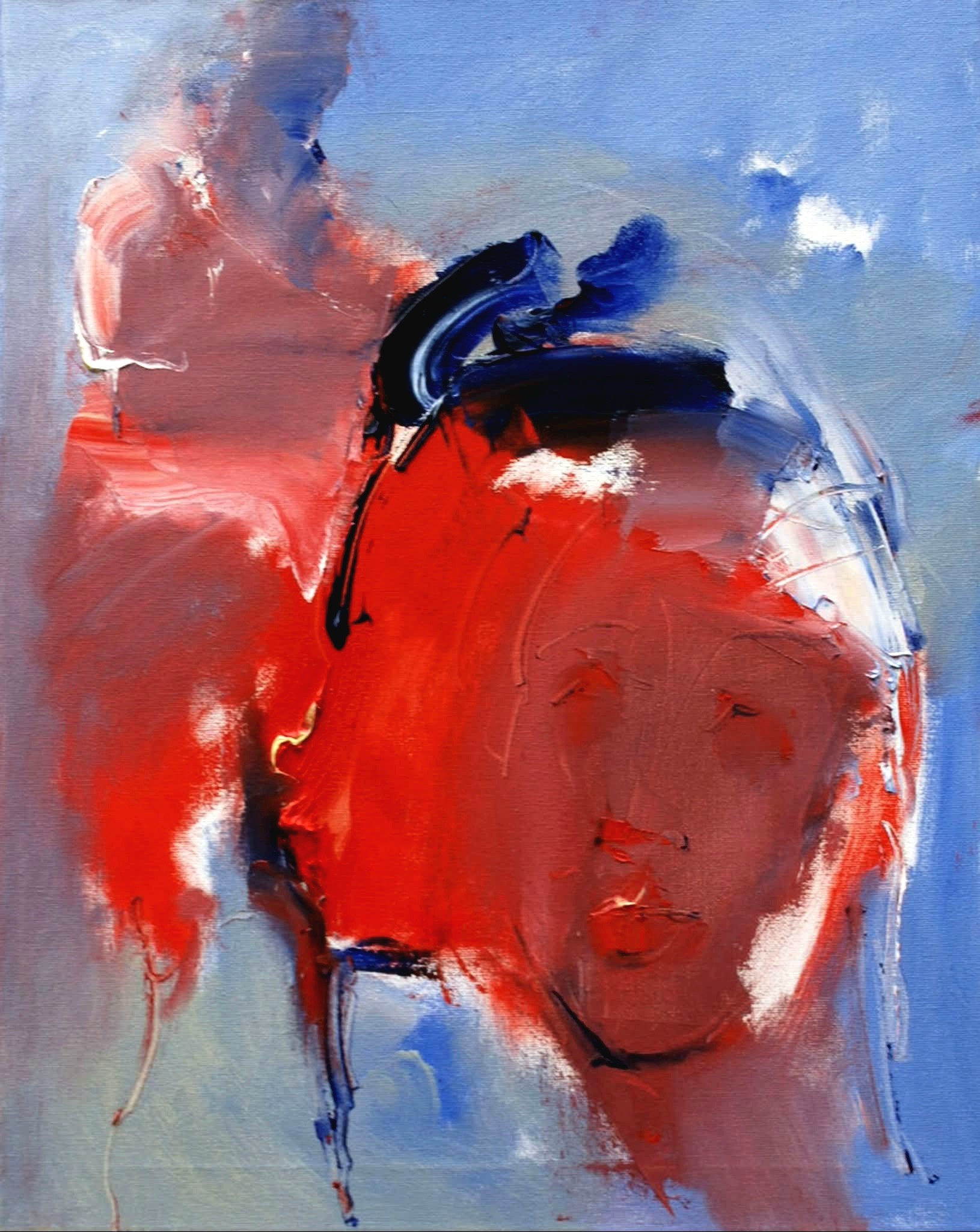 Kuqja e ndezur, e cila mbulon një pjesë të madhe të fytyrës, mund të lexohet si simbol i tensionit të brendshëm, dhimbjes, ose pasionit të thellë. Ajo nuk është thjesht një ngjyrë, por duket si një energji e derdhur mbi pëlhurë – një shpërthim i brendshëm emocional. Blu-ja në sfond dhe nuancat e bardha, nga ana tjetër, krijojnë një hapësirë të ftohtë dhe të largët, duke e vendosur figurën në një univers ku izolimi dhe reflektimi bashkëjetojnë.