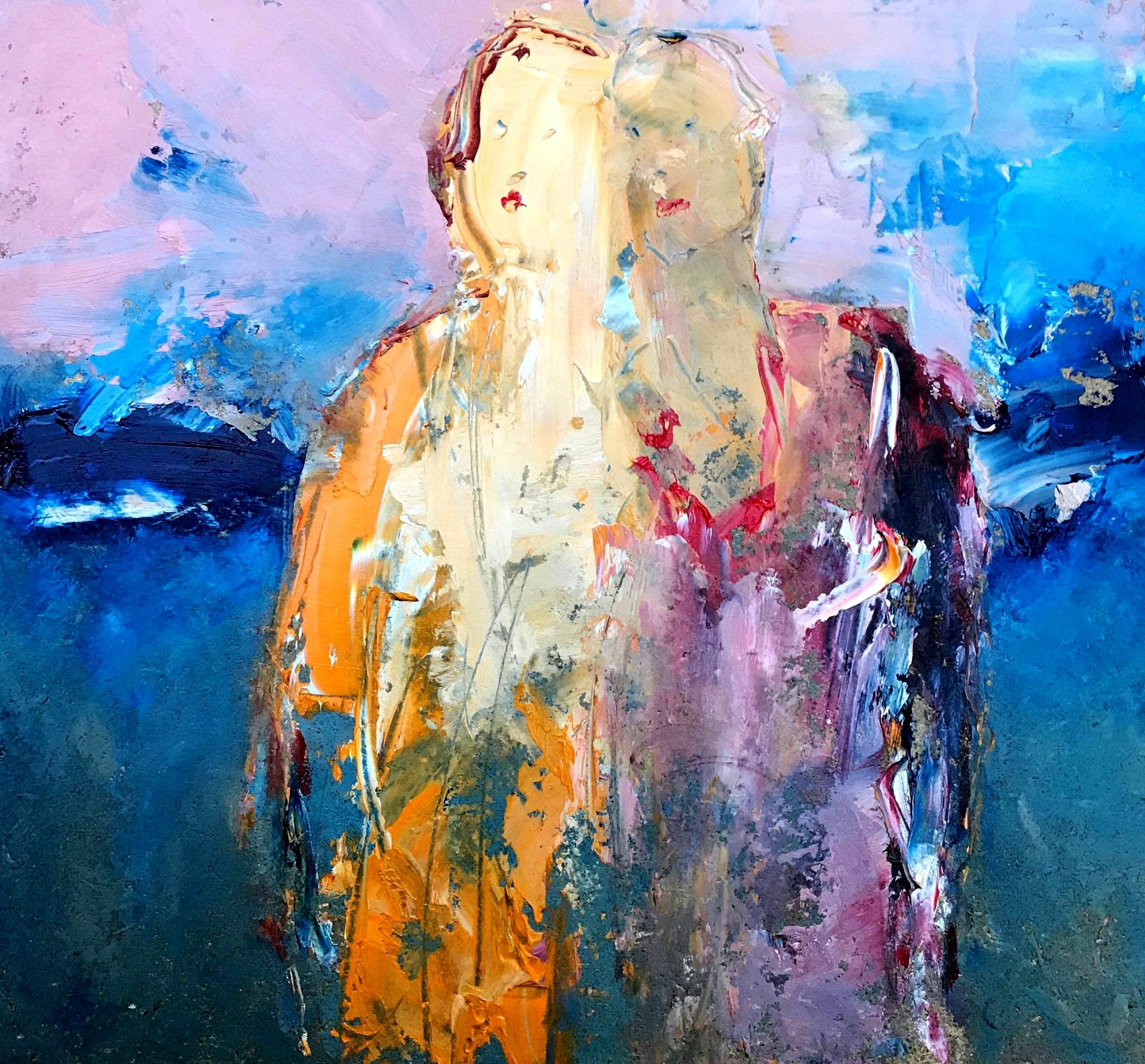 Figura qendrore shfaqet e shkrirë me sfondin, si një portret që lind e shuhet njëkohësisht. Konturet e fytyrës janë të zbehta, gati të padukshme, duke i lënë vend më shumë energjisë së brushës dhe lëvizjes së ngjyrave sesa një përshkrimi të saktë anatomik. Ky shpërbërje e formës sugjeron një shpirt në tranzicion, një gjendje të ndërmjetme mes pranisë dhe mungesës, mes kujtesës dhe harresës.