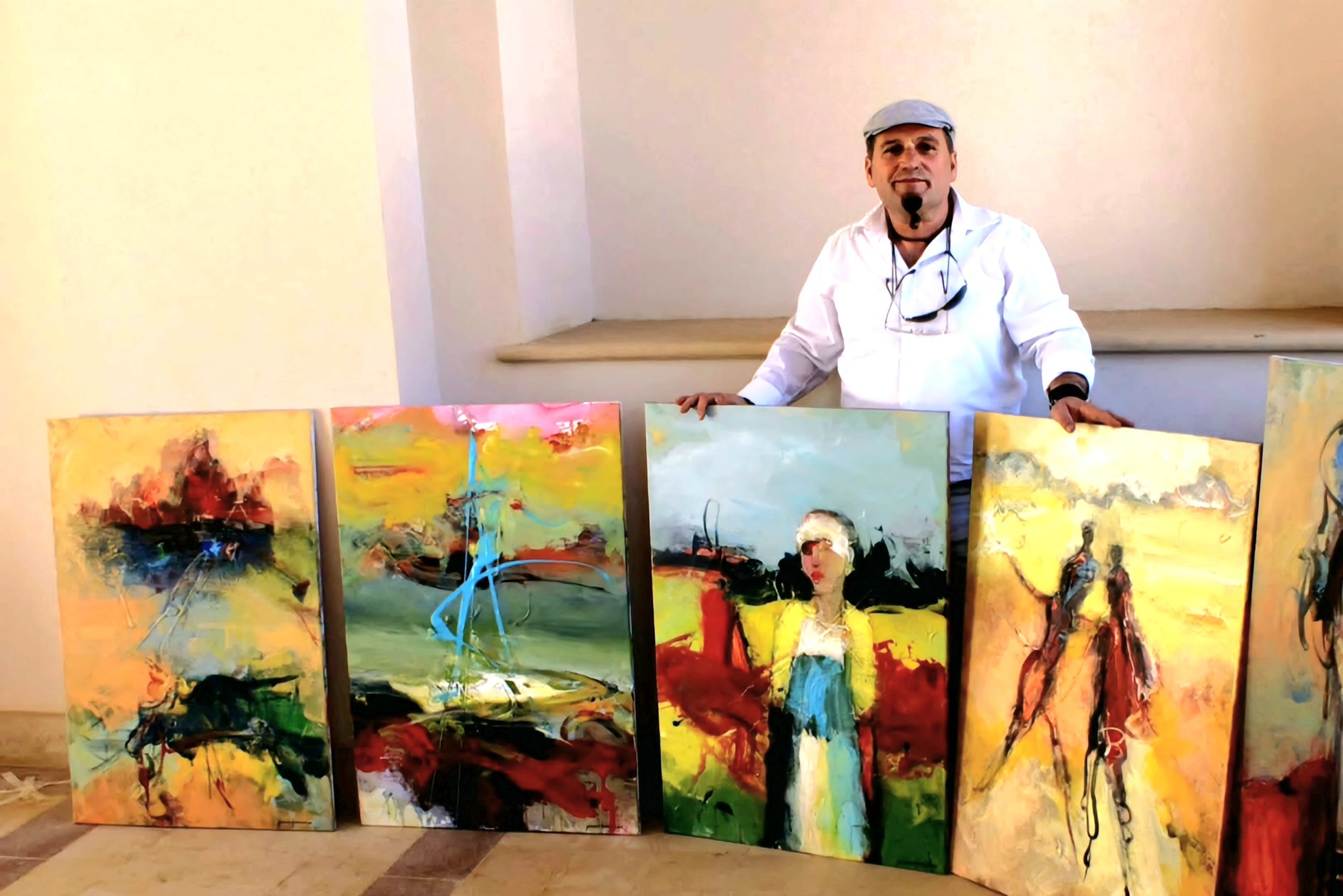 Në këtë foto shohim artistin Shefqet Avdush Emini, i cili gjendet në mesin e disa prej veprave të tij gjatë një simpoziumi të artit ndërkombëtar në Hurgada, Egjipt. Ai qëndron me krenari pranë punimeve që mishërojnë stilin e tij të veçantë ekspresionist, ku ngjyrat, lëvizjet dhe forma janë më shumë se thjesht elemente vizuale — ato janë gjuhë e brendshme shpirtërore. Të analizojmë një nga një këto piktura, duke u ndalur në gjuhën e tyre artistike dhe në emocionin që përcjellin.
