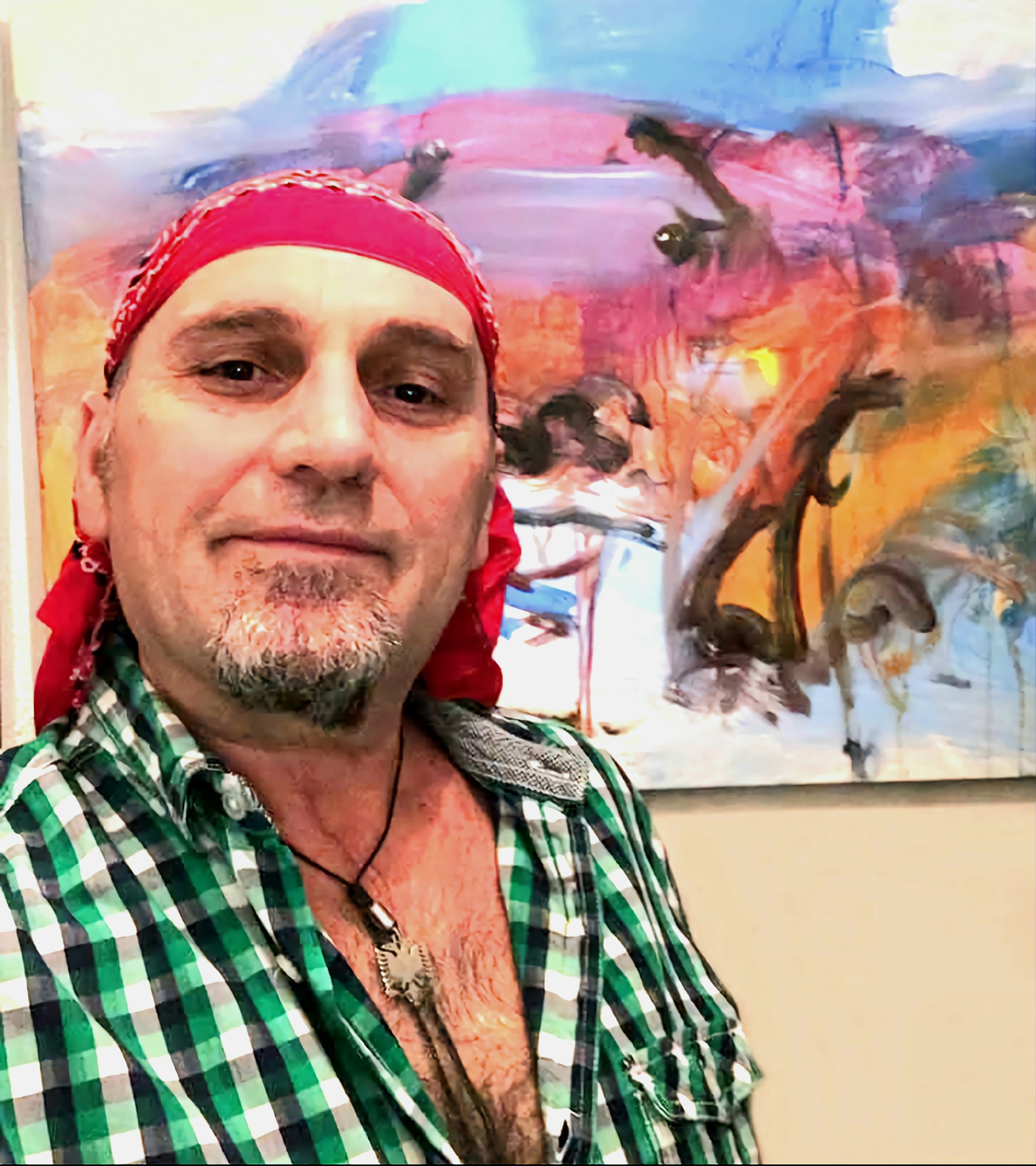 Tabloja prapa tij është një shpërthim kromatik, ku e purpurta, bluja, portokallia dhe e verdha ndërthuren në një vallëzim energjik. Forma të lira, gati figurative, shfaqen dhe zhduken brenda kompozimit, duke e lënë shikuesin të endet mes realitetit dhe abstraktes. Ky është një univers ku artisti, si krijues dhe si personazh, lë gjurmën e tij të pashlyeshme.