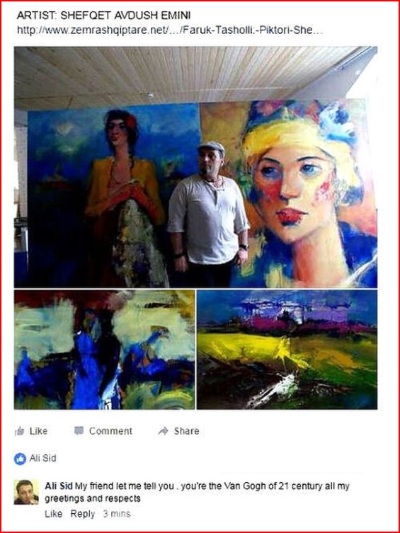 Në këtë fotografi shfaqet artisti i njohur shqiptar Shefqet Avdush Emini, duke pozuar pranë një prej veprave të tij në një ekspozitë të mbajtur në galerinë e artit në qytetin Penza të Rusisë. Pamja është një kombinim i qetësisë dhe krenarisë që ai reflekton si krijues, por edhe e ngjyrave të ndezura e dinamike të pikturës që gjendet pas tij. Muri i bardhë me tulla të ekspozuara krijon një kontrast të pastër me tonet e fuqishme të veprës, duke e vënë atë edhe më shumë në qendër të vëmendjes.