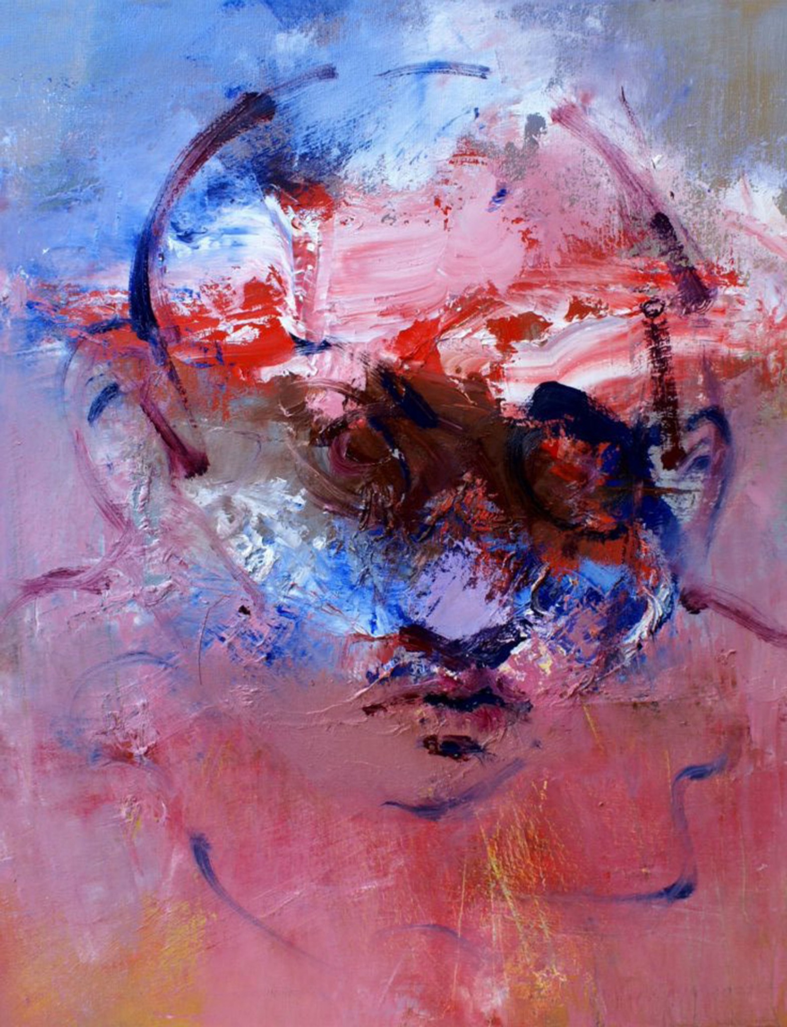 In deze compositie is het menselijke gezicht slechts een vage afdruk, een schaduw die verschijnt en oplost tussen expressieve penseelstreken. Sterke kleuren – het koele blauw, vermengd met het vurige rood en het zachte roze – creëren een dramatische spanning. Dit is geen traditioneel portret, maar een spiritueel portret, een innerlijke weerspiegeling van de mens die lijkt te dwalen tussen pijn, herinnering en existentiële dilemma’s. De contouren van het hoofd en de ogen zijn aanwezig, maar gefragmenteerd, alsof ze zijn aangetast door de storm van de tijd of door een uitbarsting van onuitgesproken emoties.